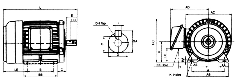 | 輸出馬力(HP) | 型號 | A | AA | AB | AC | AD | AE | B | BB | C | H | HA | HC | HE | K | KK | L | LE | 軸端 | 概略重量kg | |||||||||